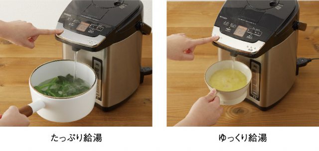 お料理には素早い「たっぷり給湯」、インスタントスープや紅茶など、少量やじっくり入れたい場合は「ゆっくり給湯」。シーンによって使い分けができます。