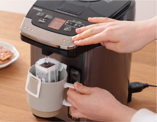 電源のない場所では、プラグを外していても注げるエアー給湯に変更ができます。まほうびん構造なので、冷めにくく、様々な場所で温かい飲み物を楽しめます。