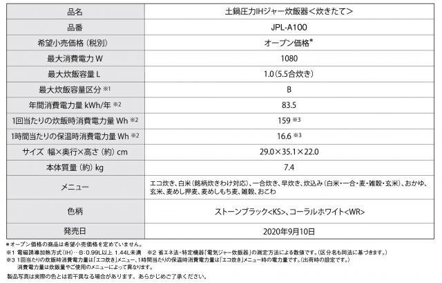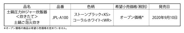 タイガー魔法瓶(株)から、<炊きたて>シリーズ50周年記念モデルとして、土鍋圧力IHジャー炊飯器<炊きたて>土鍋ご泡火(ほうび)炊きJPL-A100が2020年9月10日に発売されます。