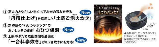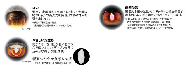 ●高火力とやさしい泡立ちでお米の旨味を守る「丹精(たんせい)仕上げ」を採用した「土鍋ご泡火(ほうび)炊き」