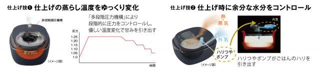 「多段階圧力機構」では、段階的に圧力をコントロールすることで、仕上げ段階の蒸らし温度を高く維持させながら、やさしく温度変化させ、お米の甘みを引き出します。