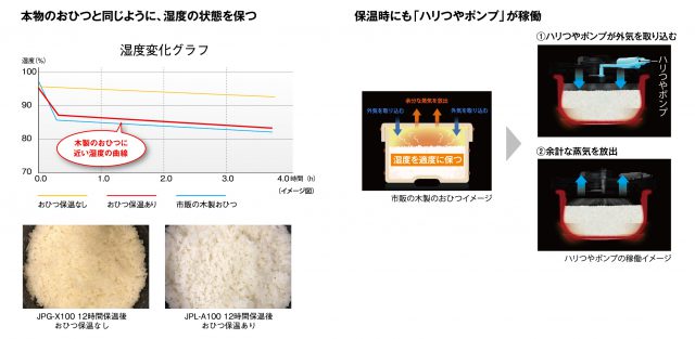 新機能「おひつ保温」では、外気を取り込んで蒸気を放出する「ハリつやポンプ」を搭載することで、木製のおひつで保温するように内なべ内の湿度を調整し、炊きたてのおいしさをずっと味わっていただけます。