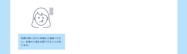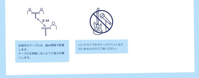 会場のエディオン久屋広場・エンゼル広場では、ソーシャルディスタンスを確保できるテーブルレイアウト、手洗い・手指消毒設備の設置や受付・販売ブースへの飛沫防止シートの設置、入場時の検温や追跡システム導入など来場者の皆様が安心して楽しめる環境を整えております。会場混雑時には、当日チケットの販売を制限する為、会場内の混雑状況をwebサイト上にリアルタイム表示し、分散来場の協力を促します。