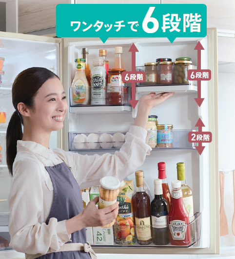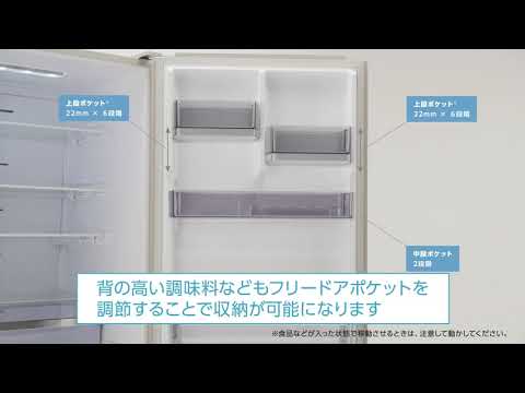 新モデル「GR-S36SV」では、様々な種類の食品を収納しやすいように、扉からドアポケットを外さずに上下にスライドするだけで、簡単に高さを6段階に調節できる「フリードアポケット」を冷蔵室の扉上段2か所に採用。2段階に調節可能な中段ドアポケットとの組み合わせで72通りに可変、自分好みのカスタマイズにも対応し、収納力が向上しています。