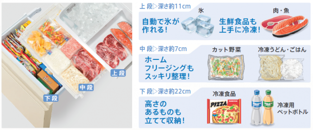 ●食品の大きさに合わせて、上・中・下段に分けてスッキリ収納できる「3段冷凍室」