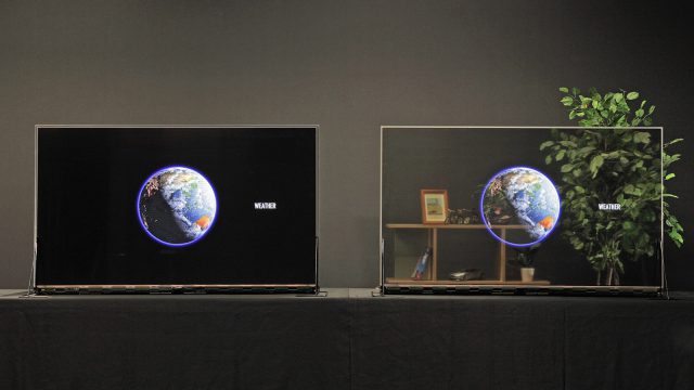 左)通常の有機ELディスプレイ、右)透明有機ELディスプレイ。