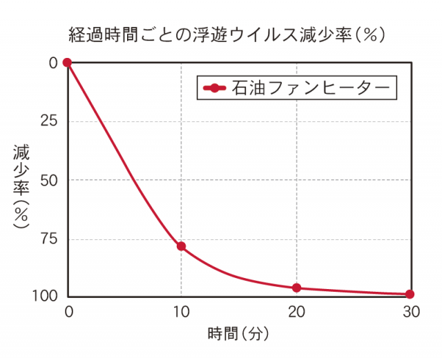 ダイニチ工業は、(一財)北里環境科学センターにおいて、日本電機工業会規 JEM1467「浮遊ウイルスに対する除去性能評価試験」を参考に、石油ファンヒーター(ウイルス除去のための改造、装置追加等はしていない)を30分間運転した際のウイルス除去効果を確認しました。(試験協力:暮らしの科学研究所(株))