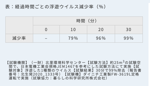 25m3空間内の浮遊ウイルスを30分で99%除去できることを確認した。