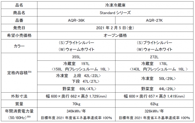 アクア(株)から、省エネ性能を向上させた「Standardシリーズ」(AQR-36K、AQR-27K全2機種)が、2021年2月5日に発売されました。