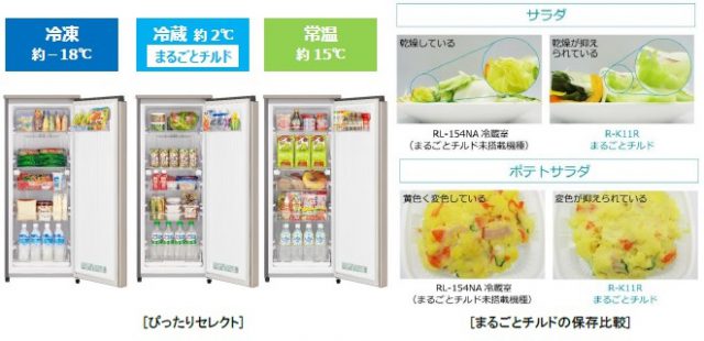 また、「冷蔵」では、庫内(ドアポケットを除く)がチルド温度約2℃、湿度約80%となる「まるごとチルド」で、食品の鮮度が長持ちさせ、一時保存のサラダはラップ無しでも乾燥を抑えられます。