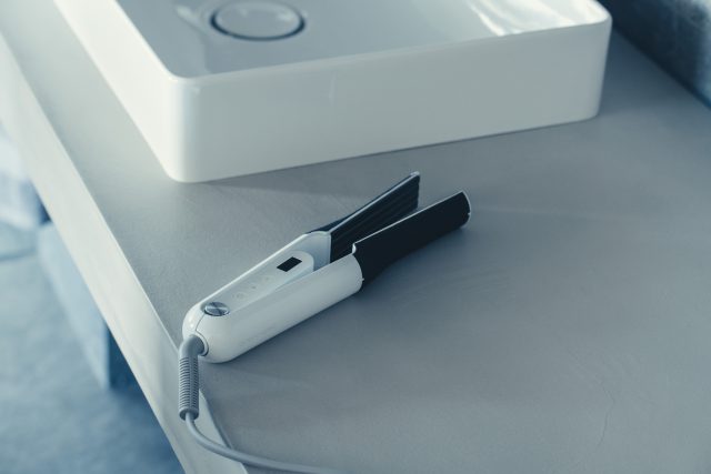 柳本氏が一番こだわったのは、「もっと髪の根元を攻められるヘアアイロン」です。髪の根元まで施術するために施術部とプレートをほとんど同サイズに設計し、縁までのクリアランスは1mm以下。プレートはアルミニウム素材にフッ素樹脂を塗布し、3本の溝を設けて毛のうねりを上手く拾えるようにしました。施術部はかなり薄いので取り回しが良くなり、耳の後ろやもみあげまわりといった難しい場所も攻めやすく、また、長めのプレートにして抑えられる髪の量を増やせるようにしました。一般的なヘアアイロンに比べて非常に軽く、コードも長いので作業時のストレスも軽減されます。こういった細かな仕様は、全て柳本氏の意見を具現化したもの。「BI-G1」は、 徹底的に“プロの道具”を目指しました。
