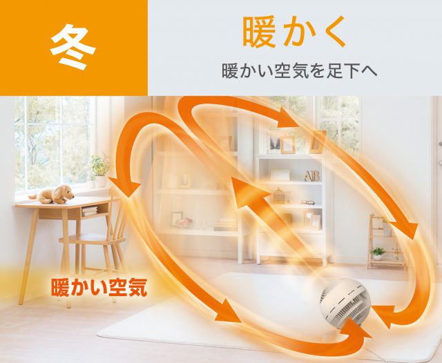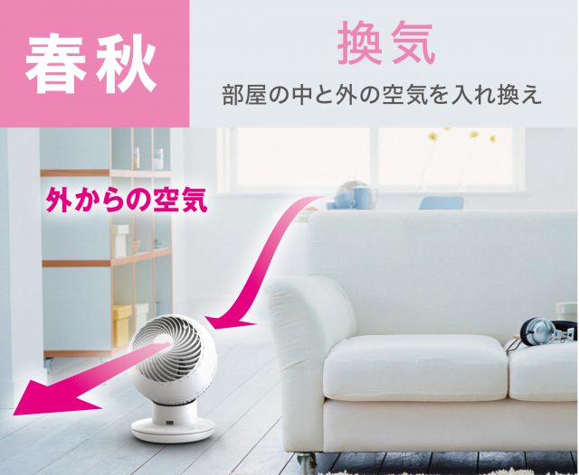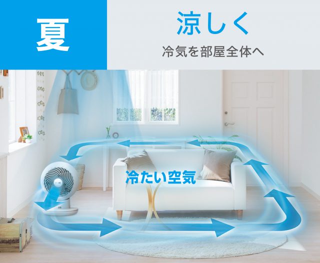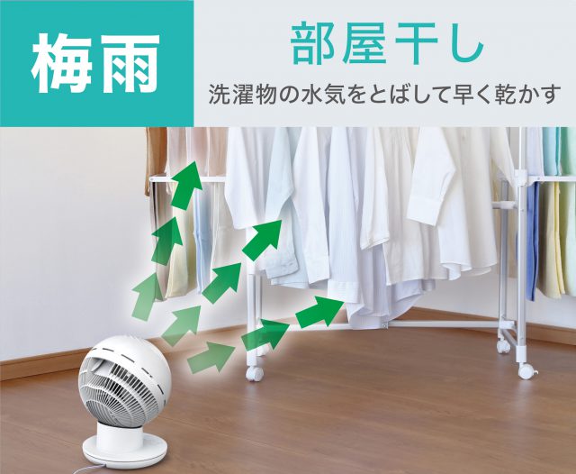 スパイラル気流の強力な風により、エアコンと併用することで空気を効果的に循環させ室内の温度差をなくしたり、冷暖房の空気を隣の部屋へ送り込んだりする用途があります。その他にも、窓辺に置くことで外の新鮮な空気を窓から取り込み部屋の換気や室内での部屋干しの際に衣類に風を当てることで、衣類の乾燥時間を短縮できる用途としても使用できます。