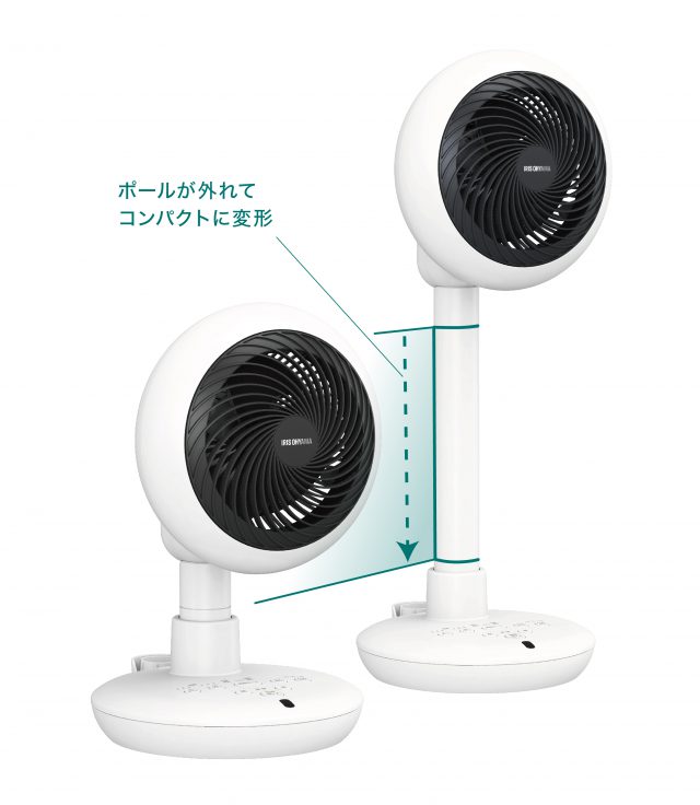 本体のポールを取り外し、本体背面のスタンドに収納できるため、本体高さ約612mmから約369mmまで使用用途に応じて変更できます。扇風機として使用する際は、ポールを取り付けて本体を高く、サーキュレーターとして使用する際は、 ポールを取り外してコンパクトな形状で使用や収納ができます。