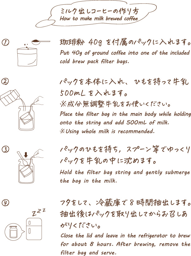 お好みのコーヒー粉40gを付属のパックに詰めたら、ポットに牛乳500mLと一緒に入れて冷蔵庫で一晩抽出するだけ。ポイントは成分無調整牛乳を使うことと、雑味が出てしまうのであまり長時間抽出し過ぎないこと。浅煎りのコーヒーでは香り高く、深煎りのコーヒーを使えばコクも出てリッチなミルク出しコーヒーができあがります。