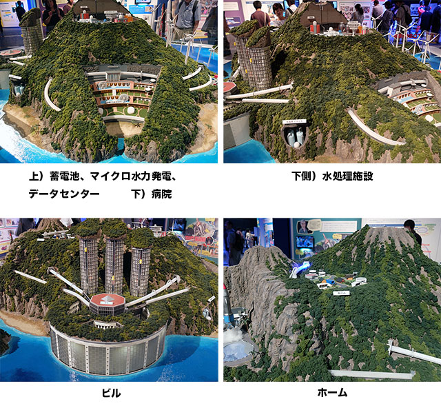 下に写真を掲載しますが、電力はマイクロ水力発電、太陽光発電、風力発電を組み合わせ、蓄電池に蓄え色々なものに使用します。多分一家だけでは、暮らして行けないと思ったのではないかと思いますが、設定にはない、病院、ビル、ホーム(居住地区)、そして交通機関として地下を走る鉄道、電気自動車が加わっています。