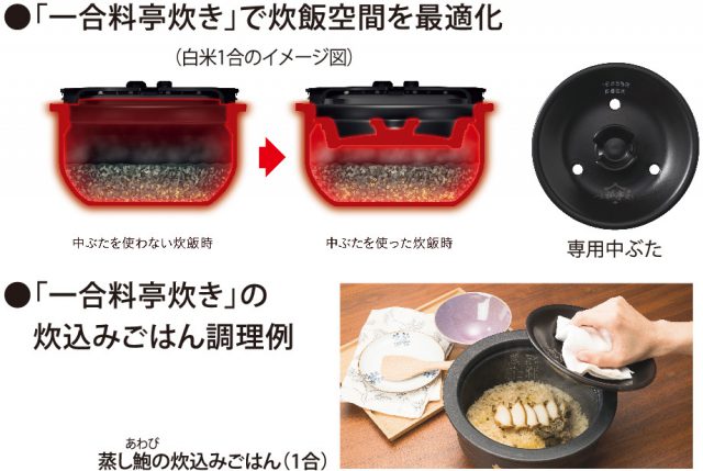 好評の少量炊飯でも料亭のようなごはんがご家庭で楽しめる「一合料亭炊き」機能。 通常、5.5合炊きで1合を炊飯すると、炊飯空間が大きくなりすぎてお米一粒ひと粒に熱が均等に伝わりにくくなります。