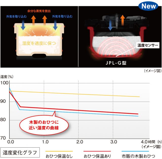新モデル「土鍋ご泡火(ほうび)炊き JPL-G100」では、本体の底に搭載している温度センサーによって、呼吸が必要かどうか判断して湿度を細かく制御。呼吸回数を増やすことで本物のおひつに近づきました。においと黄ばみを低減し、炊きたてのおいしさを長持ちさせます。