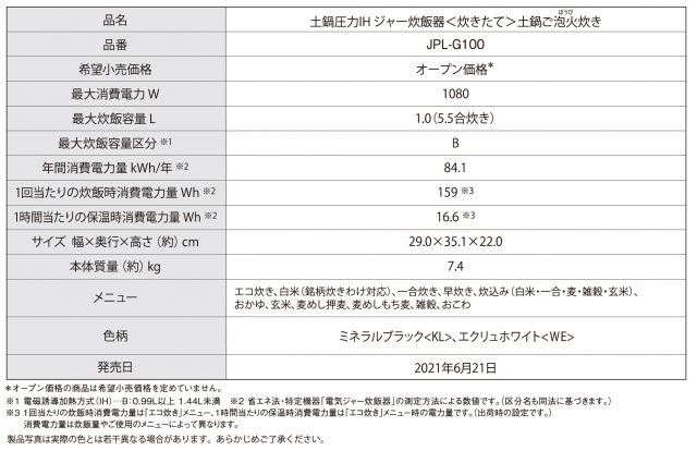 「土鍋ご泡火(ほうび)炊き JPL-G100」製品ページ