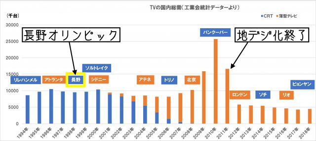 で、日本選手が大活躍して、日本中が沸いた長野オリンピックの時、テレビの出荷が多いかと言うと、そうではありません。むしろ少ないくらいです。このことからも「オリンピックがあると、テレビが売れる。」必ずしも真実ではないことが、分かります。