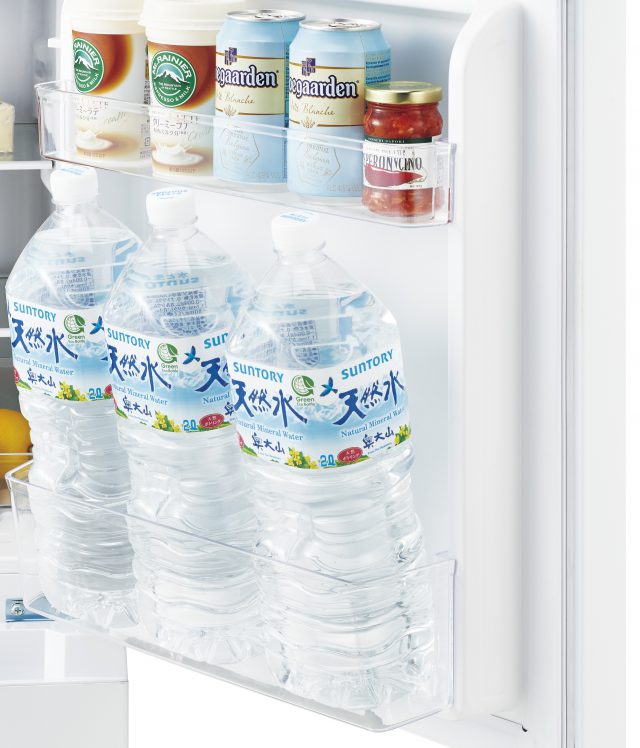 日々のくらしに「あったら嬉しい」機能が充実したモデルを目指しました。使用頻度が高い冷蔵室は、500mlペットボトルや350ml缶も立てた状態で収納が可能。下段では、500mlペットボトルを寝かせて収納できる広さです。