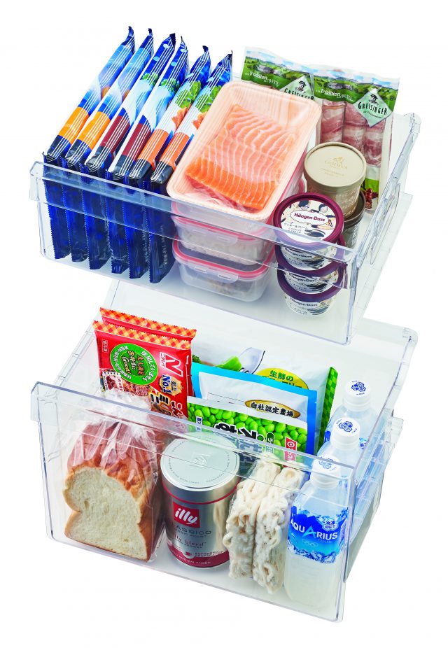 冷凍室には見やすく整理しやすい上下2段の「引き出し式クリアバスケット」を採用。上段は少し浅く、冷凍食品やアイスクリームなど小さめの食材を収納可能。下段は大きめで500mlペットボトルを立てて凍らせることができます。透明な引き出しだからフードロスを防ぐことができます。