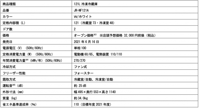 ハイアールジャパンセールス(株)から、シンプルなデザインで、置き場所を選ばないコンパクト設計の121L冷凍冷蔵庫(JR-NF121A)が、2021年6月16日より全国の家電量販店、ホームセンター、 GMS、WEB通販などで順次発売されます。なお、オープンプライスでの販売です。