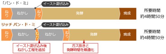 パナソニックの調査では、お店で購入した「高級食パン」を食べたことがある人は、半数以上にのぼります。パナソニックは従来より高級「生」食パン専門店 「乃が美」監修レシピ「おうち乃が美」により、手づくり生食パンを楽しむ提案をしてきました。生クリームなどの副材料を多く使用するパンは、グルテン生成が難しく、膨らみにくい傾向があります。新搭載の「リッチ パン・ド・ミ」メニューでは、「パン・ド・ミ」メニューよりも「ねり」と「ねかし」の工程を増やし、「ねかし」の工程で粉と水の結合を促してしっとりとした生地にします。また「発酵」の工程では、細やかな温度調整と最適なガス抜きをすることで、きめ細やかな仕上がりを実現しました。