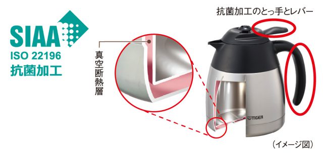 そんなタイガーは、家庭やオフィスでも、より安心、より安全にコーヒーをお楽しみいただくため、今回の新モデルには、付属の真空断熱ステンレスサーバーのとっ手とレバーに、SIAA(抗菌製品技術協議会)認証の抗菌加工が施されています。