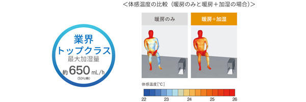 ヒーターで温めて加湿した空気を大風量で吹き出すことにより加湿量が約20%アップし、コンパクトサイズながら業界トップクラスの最大加湿量650mL/hを実現しました。加湿しながら暖房を行えば、暖房運転のみの場合と比べて体感温度が上がるので、より快適な暖かさを実感できます。また、リビングなどの広い部屋の加湿にも対応します。