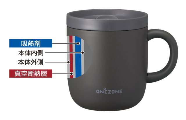 飲みやすい温度をキープする、真空2重構造の内側に吸熱剤を入れたステンレス3層構造になっています。
