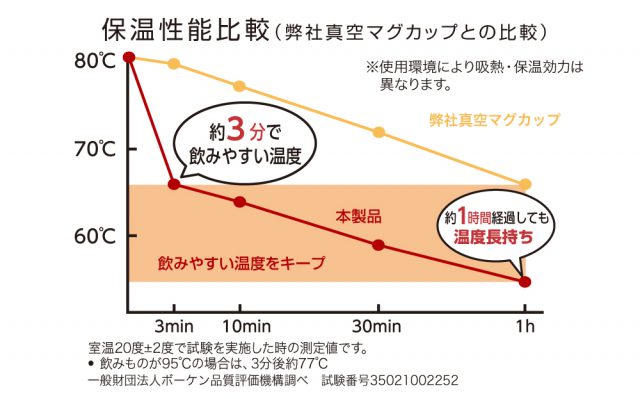本モデルと、ドウシシャ製ステンレス真空2重構造マグカップの保温性能を比較したところ、本モデルは80℃の飲み物をいれて、3分後に約67℃になり、 ステンレス真空2重構造マグカップでは約79℃のままでした。