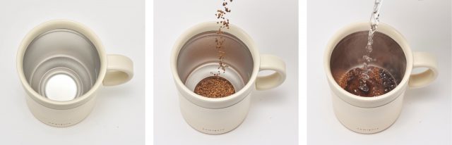 マグの内側の底面にはくぼみがあり、そこにインスタントコーヒーの粉をぴったりいれることで、適切な量4gをはかることができます。また、マグの内側にはコーヒーの粉量4gに対して最適な水量280mlのラインが入っています。商品のより詳しい情報は、以下のURLでご確認ください。