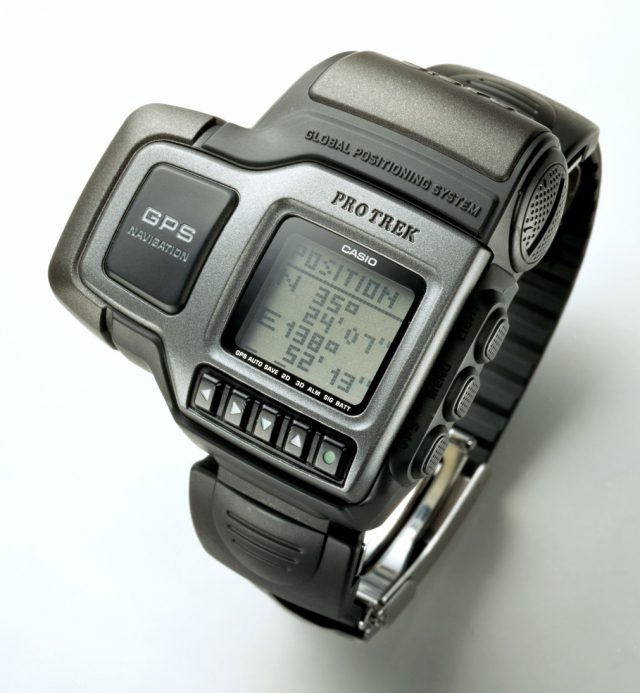 今回登録された「PRT-1GPJ」は、アウトドアウオッチ“PRO TREK(プロトレック)”シリーズの最上位モデルとして“サテライトナビ”の愛称で発売されました。カシオ社のLSI技術・高密度実装技術により、GPS機能を世界で初めて搭載し、当時、販売されていたハンディタイプのナビゲーション機器に比べ、大幅な小型・軽量化を実現。現在位置の緯度・経度を計測するだけでなく、目的地を設定(緯度・経度)しておくことで、現在地から見た目的地の方向と距離をグラフィック表示する機能や、緯度・経度を記憶する機能も備えていました。ちなみに、カシオの製品としては8件目になります。