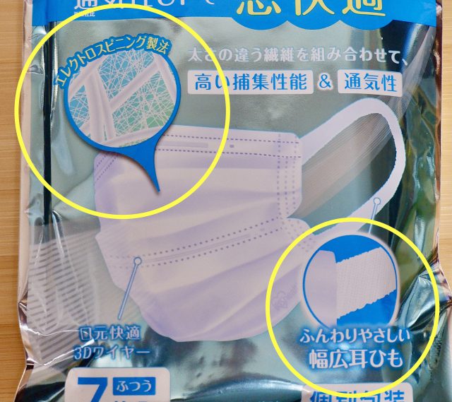 さて、次に書かれているのは、マスクのもう一つのポイント防御性です。『花粉・ウイルス飛沫・細菌飛沫・PM2.5等をカット!』とあり、その下に小さく『※マスクは感染(侵入)を完全に防ぐものではありません。』『※マスク本体部の身の性能』とあります。ここで問題があるとすると「飛沫」の文字でしょうね。裏面は「飛まつ」で統一されているのに、表面は「飛沫」です。これは「飛まつ」の方が、文字スペースをとるので妥協したためだと思われますが、妥協するなら「裏面」だと思います。「顔(表面)」に傷を付けるのは、正直良くありません。