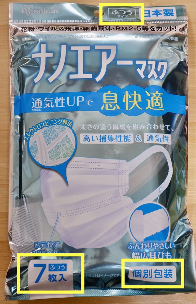「アイリスオーヤマのロゴ」「「7枚入り」「ふつう サイズ」、そして「個別包装」。枚数とサイズは、買いミスを防ぐためです。しかし『個別包装』は異なります。こちらは衛生をうたっています。
