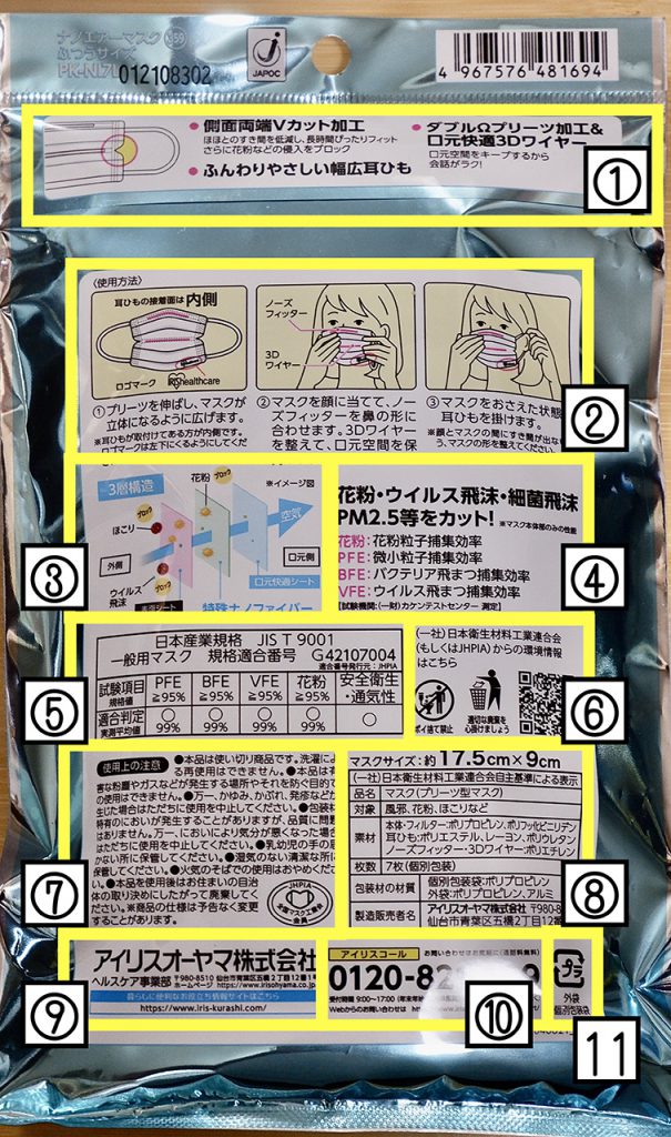 ①表面に書ききれなかった特徴、②マスクの使い方、③フィルタリングの説明図、④用語の説明、試験先、⑤JIS認定表、⑥日本衛生材料工業連合会の環境情報、⑦使用上の注意、⑧日本衛生材料工業連合会自主基準による表示、マスクサイズ、⑨事業者情報、⑩コールセンター電話番号、11 外装材料表示