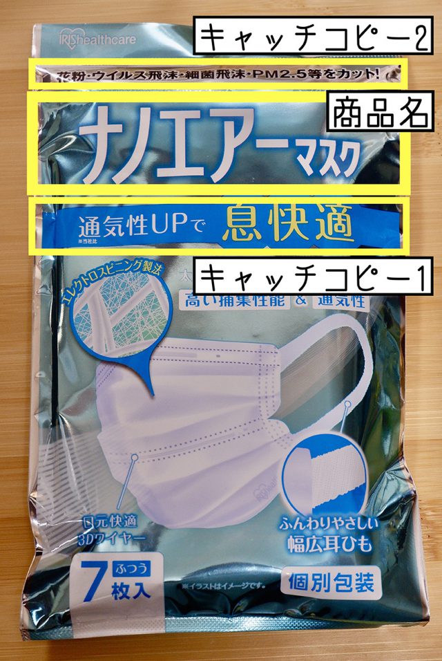 2つ目は、このマスク、性能がいいんだというイメージを持ってもらうことです。極端にいうと「ウイルス飛まつを××%防げます」というのではなく、「すごそう」「性能良さそう」というイメージを、ユーザーが持ってくれれば、それでいいのです。そしてそれを認識させるのが「キャッチコピー」です。数字より、記憶に留まりやすい言葉でアピールします。