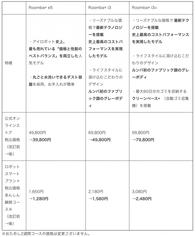それを受け、アイロボットジャパン合同会社はこのリブランディングにともない、ロボット掃除機「ルンバ e5」ならびに「ルンバi3シリーズ」の価格を変更を行いました。よりリーズナブルな価格で、お買い求めできます。