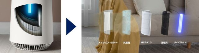 今回発売のモデルにはUV-Cライトが新搭載されており、フィルターに付着したウイルスを1分間で99.9%除菌しながら運転することで、さらに清潔な空気環境を実現することが可能となっています。