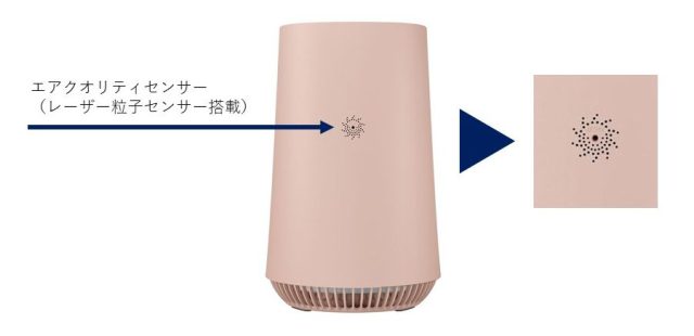 スマートモードでは、本体脇に搭載されている“エアクオリティセンサー”で、 リアルタイムで空気のコンディションを計測。「レーザー粒子センサー」が空気の状態を検知し、自動でファン・スピードを切り替えます。
