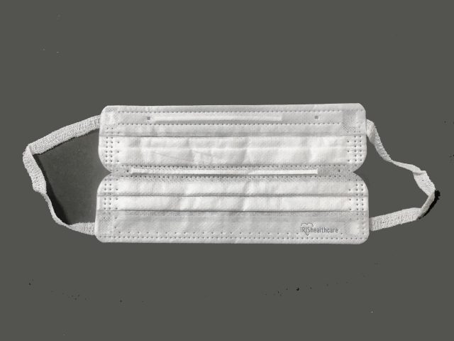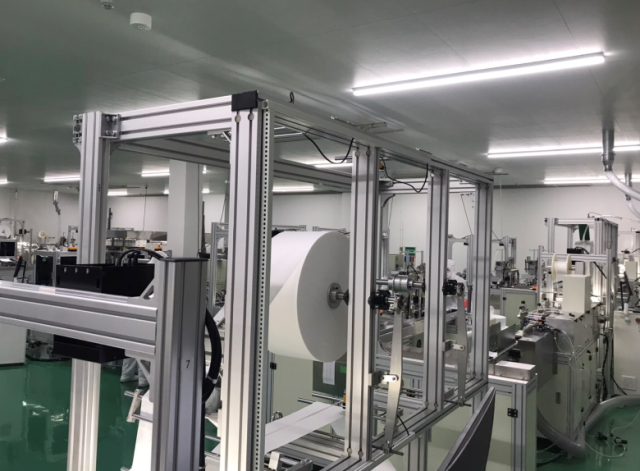 マスクは不織布のロールを加工機でマスクに仕立て上げます。マスク1枚分の不織布を切り出し、折るなどして形にして、超音波溶着。耳紐を付け超音波溶着。品質チェックを行い、問題がなければ、1枚出来上がります。