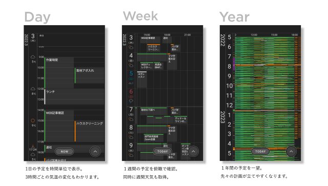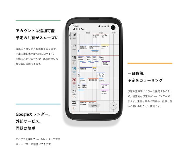 予定と共に1週間の天気も確認できるため、週末の旅行の準備にも役立ちます。Google、Microsoftの外部カレンダーデータベースと同期が可能。複数のアカウントを登録することで、予定の確認がさらに見やすく便利に。この新しいスケジュール管理は、すべてのAndroid端末(※)をご利用の方々に体験いただけます。(※利用可能環境はAndroid9以降)