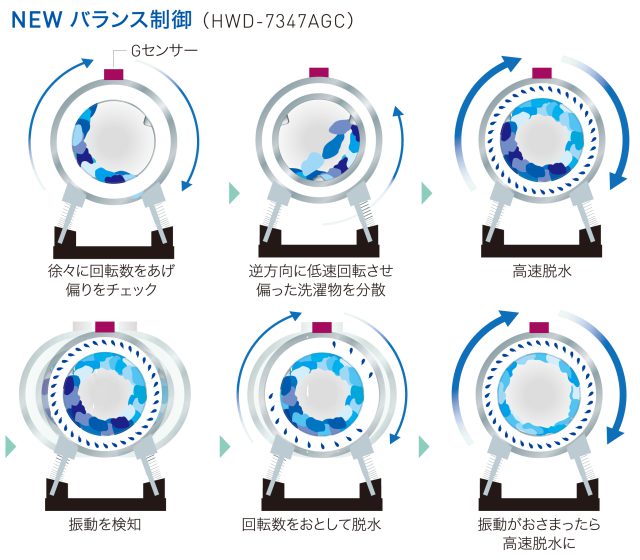本モデルは、ドラムの振動を抑える構造が一新されています。ドラムの振動を検知するGセンサーを採用したことにより、立ち上がり時だけでなく高速回転時も振動を検知し、回転をコントロールすることで振動の大幅な抑制を実現しています。さらに、強化防振構造により、高速脱水と静音運転を可能にしています。●洗濯物の出し入れのしやすさを向上