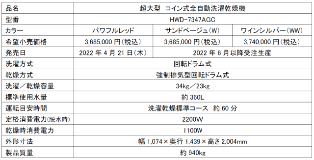 アクア(株)から、コインランドリー向けの業務用「超大型コイン式全自動洗濯乾燥機」(HWD-7347AGC:洗濯容量34kg/洗濯乾燥容量23kg)が、2022年4月21日(木)に発売されます。