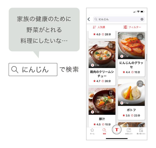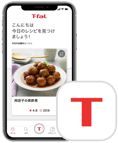 また、各レシピに必要な食材から買い物リストを作成できるので、お買い物のときにも便利。よく作るレシピは「お気に入り」に登録すれば、 すぐにアクセスできるので探すのに手間取りません。 新しくなった「ティファールアプリ」を、 是非この機会にダウンロードしてお使いください。