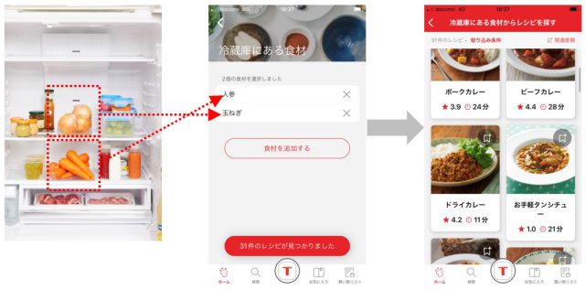 食材やレシピ名で検索できる。●冷蔵庫の中の食材で検索
