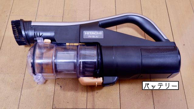 もう一つ面白いのは、バッテリーの取り付け方です。日立はメーカー方針として、スティック型掃除機のバッテリーの交換システムを持ちます。利点は、バッテリーを交換することにより、動作時間を延長できることです。例えば一つのバッテリーで30分なら、フル充電バッテリーを2つ用意すると60分使えるわけです。