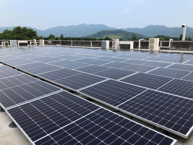 日立GLS栃木事業所の開発建屋屋上に並べられた太陽光パネル。