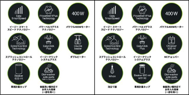新モデルは、ハンドブレンダーの基本機能である「つぶす」「混ぜる」に加え、お菓子づくりに便利な新アタッチメントの「ダブルビーター」(MQ7005BWHに付属)もしくは、毎日のお料理の下ごしらえに便利な「泡立て器」「MCチョッパー」「アイス用カッター」「おろしディスク」(MQ7035IGWHに付属)が付いた、 幅広いシーンで活躍できます。また、既存のMQ7シリーズと同じ、ブラウンが独自開発した400Wハイパワーモーターに加え、新モデルでは「パワーベル Vプラス テクノロジー」を搭載しており、食材を撹拌(かくはん)するスピードが最大+40%も向上、最大5倍のきめ細かな仕上がりアーモンドミルク撹拌におけるMQ100との比較となっています。