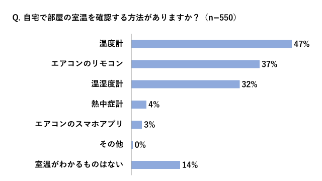 快適な空気環境を作るためにも、温度計などで室温を確認していただきながら室内温度を調整することが重要です。室内温度については、86%が自宅の室内温度を確認する方法がある一方で、14%は「ない」と回答しており、温度計をお持ちでない方は、この機会に実際の室内温度をチェックしてみるのも良いでしょう。